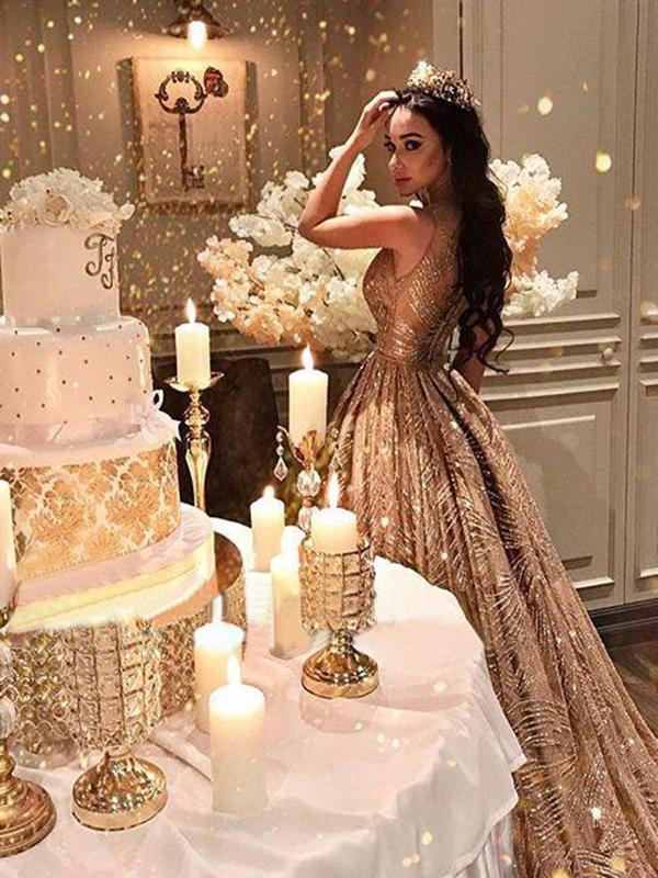 Chic Gold Prom Dress Vintage Unique Long Prom Dress