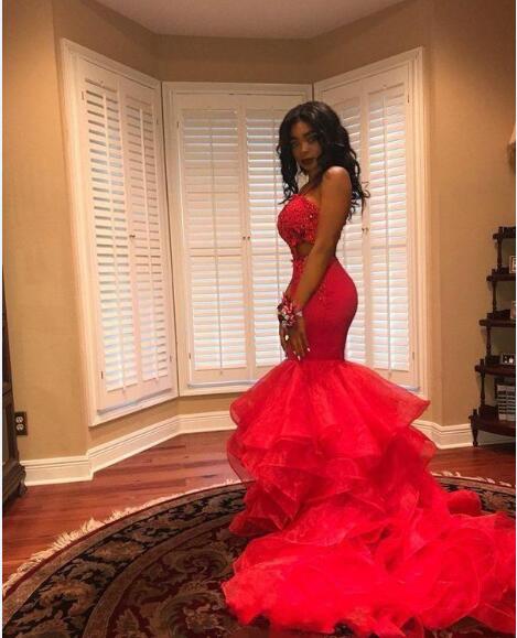 Hot Sale Organza Tiered Long Mermaid Prom Dresses Sexy Cutaway Sides Applique Spaghetti Straps Evening Party Gowns