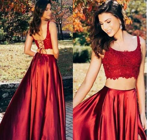 Sexy Two Piece Dark Red Long Prom dress with Lace Appliqued Side split Satin Back Lace Up Floor Length formal Evening Wear Custom