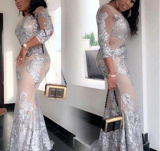 South African Plus Size Women Prom Dresses 2019 Sexy See Through Silver Lace Applique Evening Gowns Mermaid Sheer Long Sleeve Party Vestidos