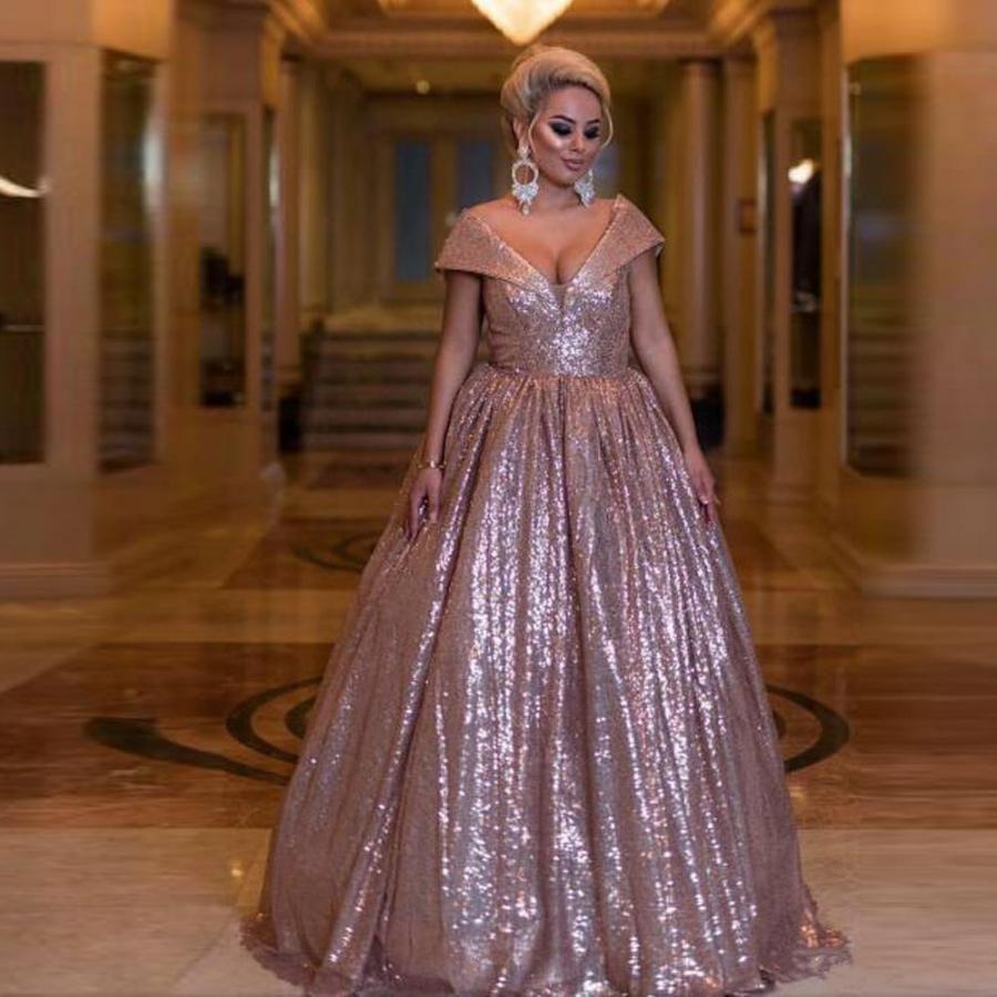 Sparkly Rose Gold Prom Dresses Deep V Neck Cap Sleeves Sequined Evening Gowns Plus Size A Line Women Formal Party Dress Custom Made