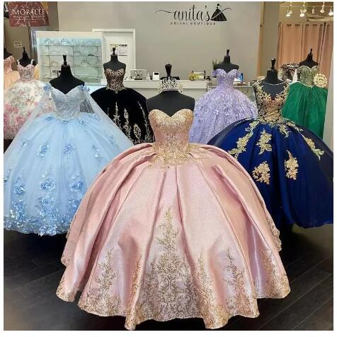 Pink Quinceanera Dresses with Gold Lace Applique Elegant Off the Shoulder Satin Sweet 16 Birthday Party Ball Gown Custom Made vestidos