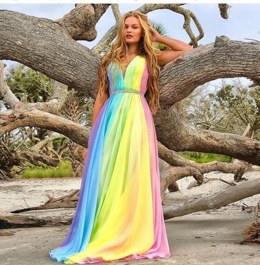 Ombre Colorful Prom Dress Sheer Deep V Neck A Line Pleated Evening Gowns Rainbow Sweep Train Chiffon Plus Size Special Occasion Formal Dress