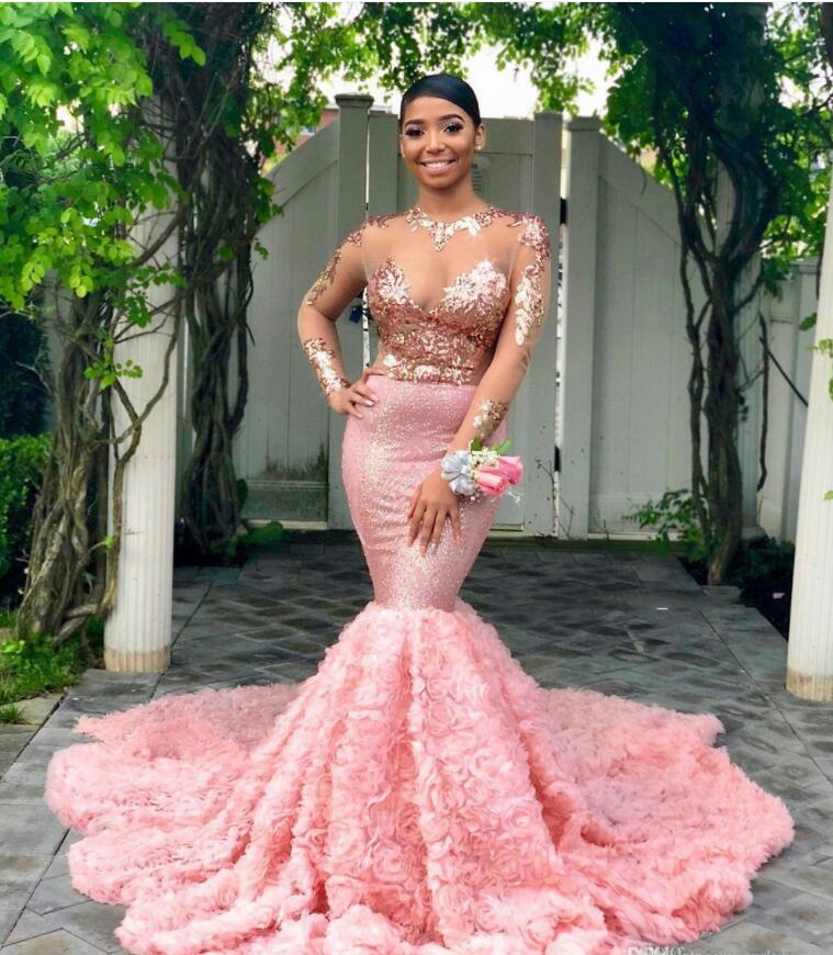 Pink Long Sleeves Black Girls Prom Dress Mermaid Formal Pageant Holidays Wear Graduation Evening Party Gowns Custom Made Plus Size