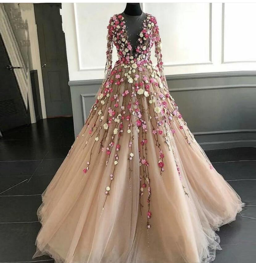 Fairy 3D Floral Flowers Prom Dresses Long Sheer Neckline Handmade Flowers Tulle Long Sleeves Chic Evening Dress Tulle Princess Party Gown