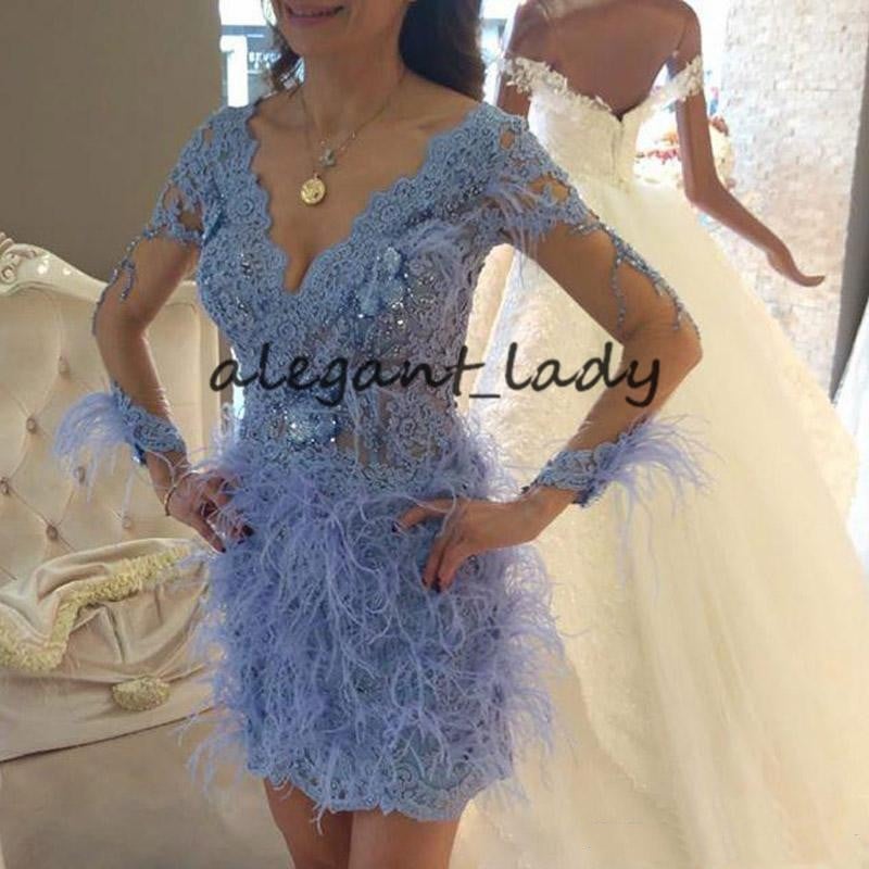 Sexy Illusion feather Mini Prom Dresses Deep V-neck Appliques Crystal Cocktail Dress Short lilac Evening Party Gown with Long Sleeve