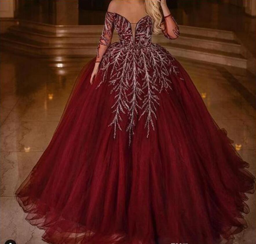Glamorous Burgundy Ball Gown Evening Dresses Illusion Neck Long Sleeve Beading Sequined Pageant Gowns Tiered Tulle Abriac Evening Gown