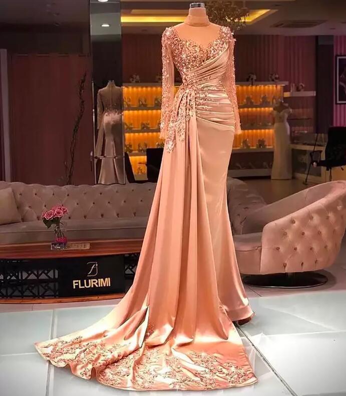 Prom Party Gown New Evening Dresses Plus Size Formal Floor-Length Custom Applique Illusion Long Sleeve High Neck Beaded Mermaid Satin Sequins