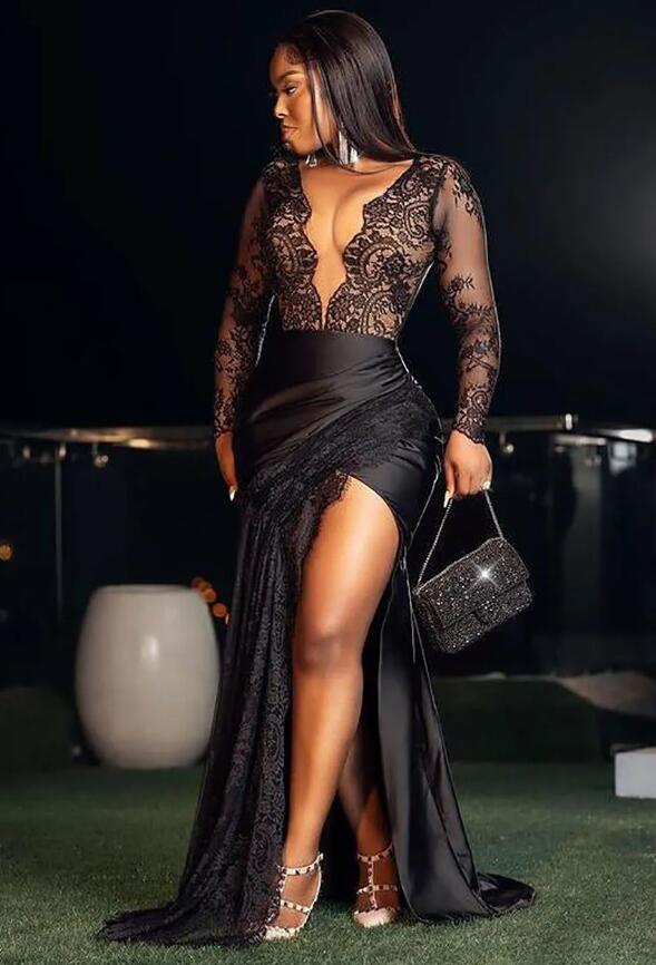 Black Sexy Mermaid Prom Dresses Sexy V Neck Sequins Beads Long Sleeves Glitter Elegant Floor Length High Waist High Side Split Evening Formal Dresse