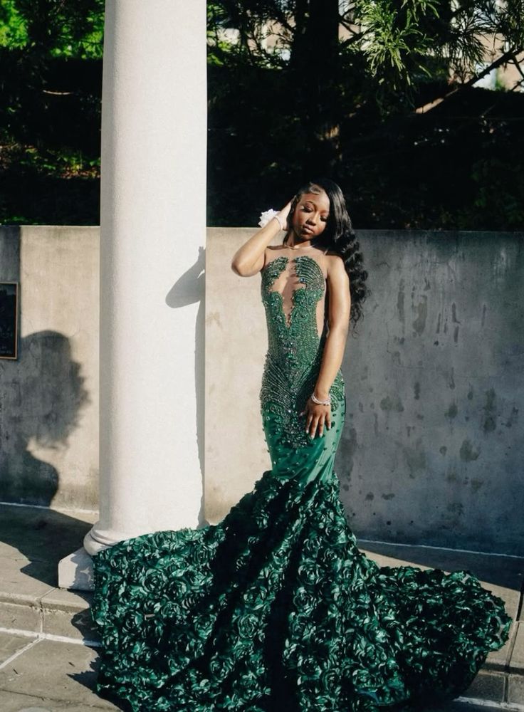 Green Mermaid Prom Dresses Beading Crystals Lace African Girls Evening Gowns Formal Party Gowns