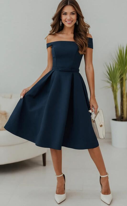 Navy Blue A Line Prom Dresses Tea-length Evening Gowns Formal Party Gowns