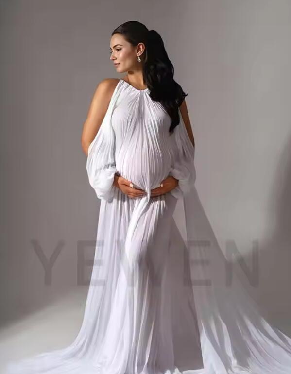 Pleated Blue Dress for Pregnant Women for Photo Shoot Elegant Off Shoulder Baby Shower Dresses Maternity Photoshoot
