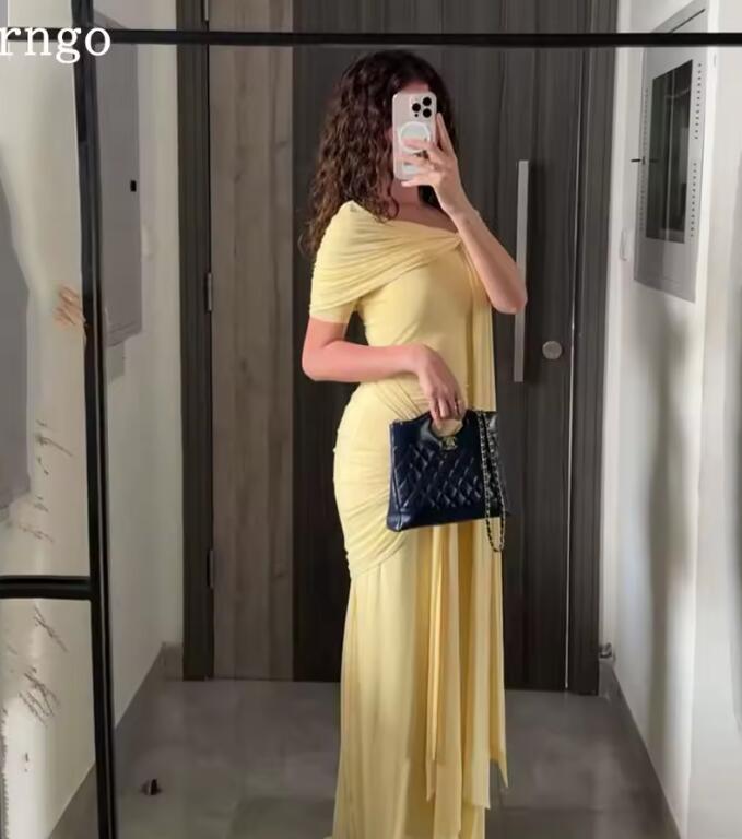 Blush Yellow Crepe Evening Dress Off The Shoulder Mermaid Formal Occasion Pleat Prom Party Gowns Customized