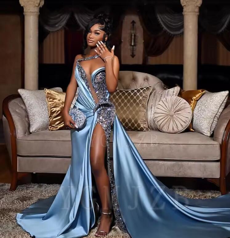 Luxury Rhinestone Diamond Mermaid Long Prom Dresses For Afrcian Girls 2025 Sexy Sheer High Slit Evening Gown Customized