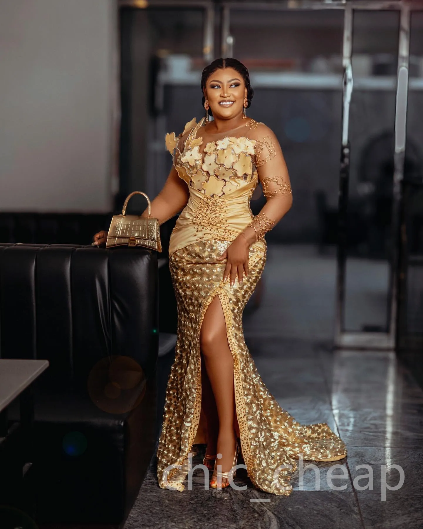 Aso Ebi Plus Size Gold Mermaid Prom Dress Lace Florals Evening Formal Party Second Reception 50th Birthday Engagement Thanksgiving Gowns