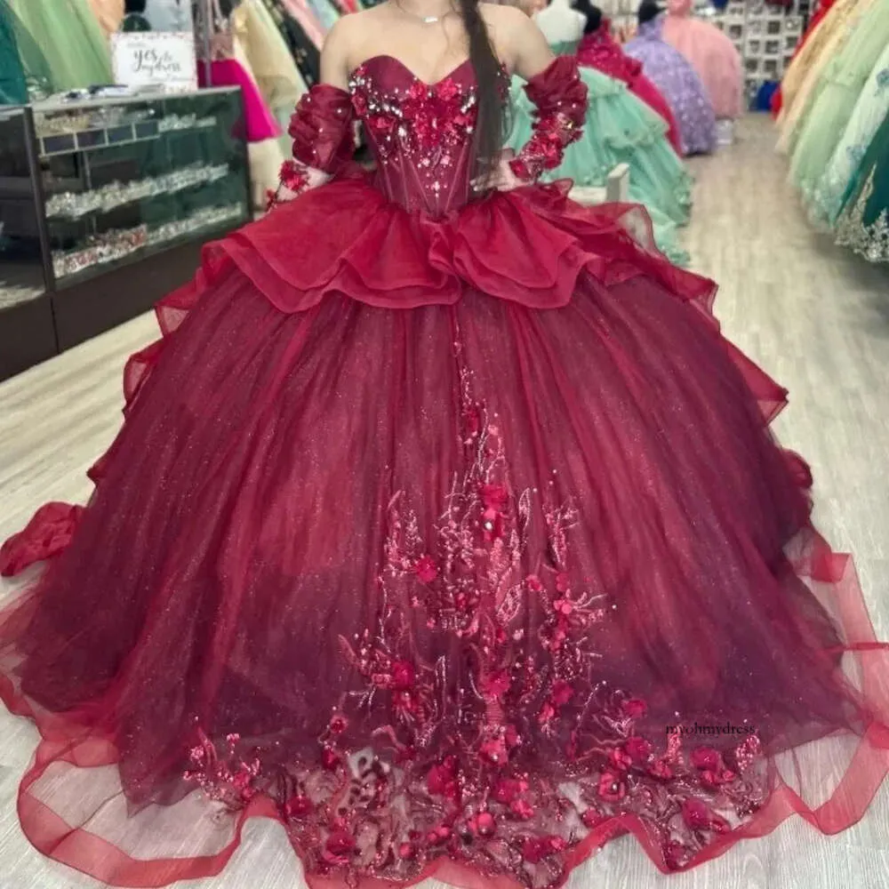 Sweetheart Bury Quinceanera Dress Long Sleeved 2024 Party Gown Princess Lace Appliques Beads Off The Shoulder For 16 Years