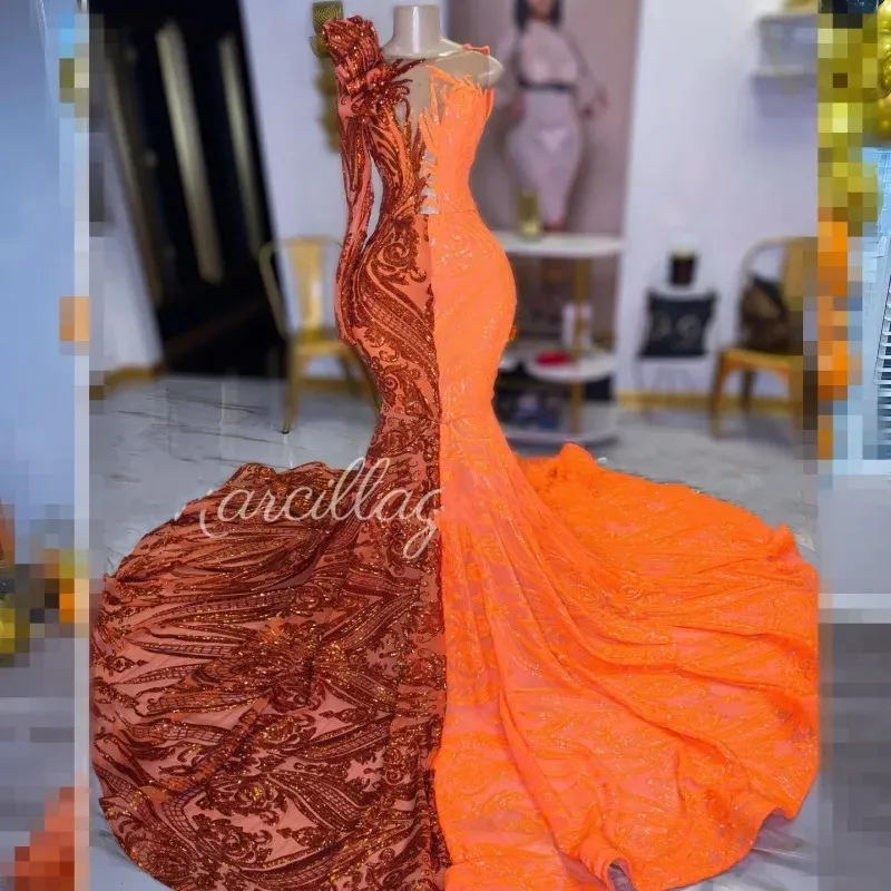 Sparkle Orange Prom Dresses For African Girl Sheer Neck Mermaid Party Gowns Long Sleeve One Shoulder Sequin Vestidos De Festa