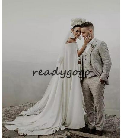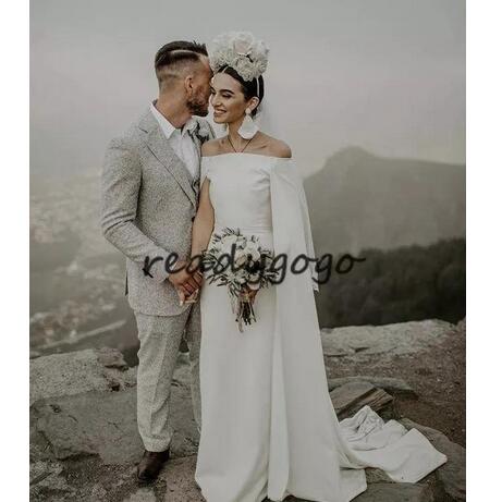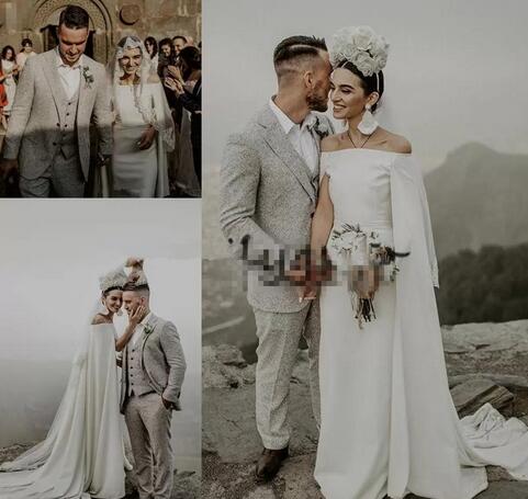 Vintage Boat Neck Wedding Dresses Special Cut Cape bohemian Bridal Gowns Sweep Train Elegant Simple Modern Vestido De Noiva