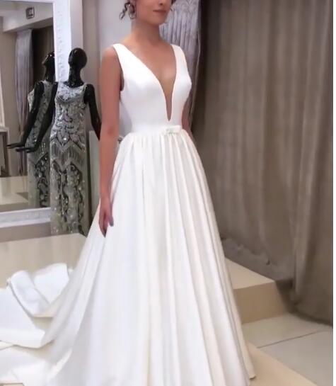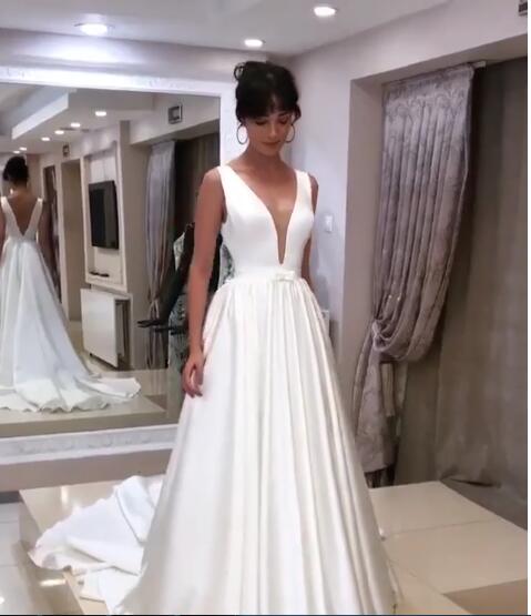 Simple Ball Gown Wedding Dresses Deep V Neck Backless Small Bow Bridal Gowns