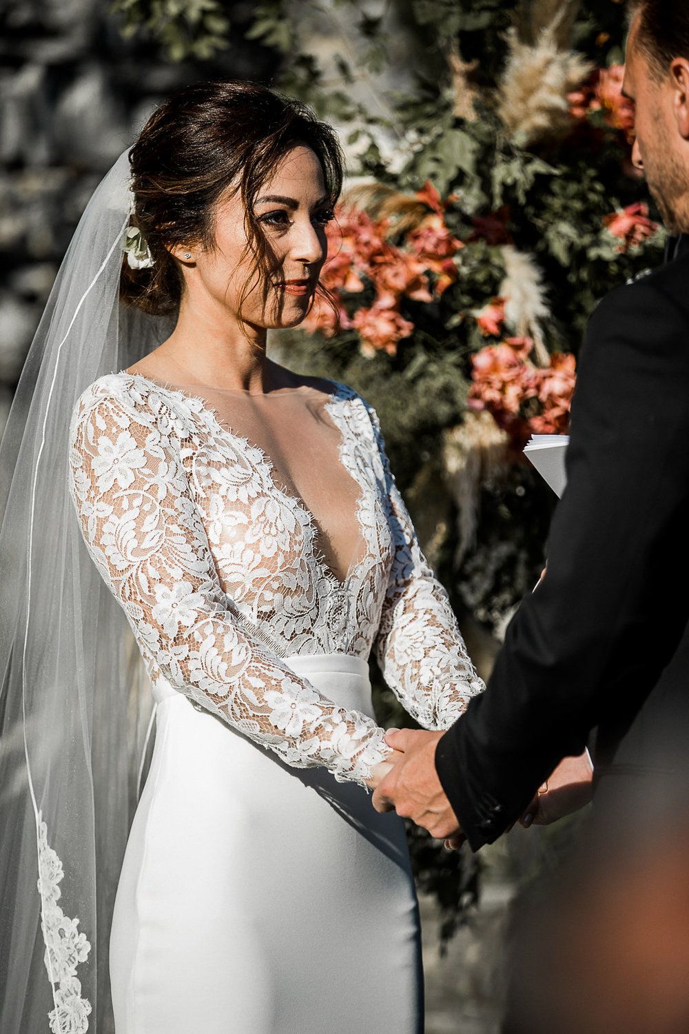 Bohemian Mermaid SatinWedding Dresses Sheer Crew Neck Long Sleeve Delicate Lace Keyhole Back Bridal Gowns