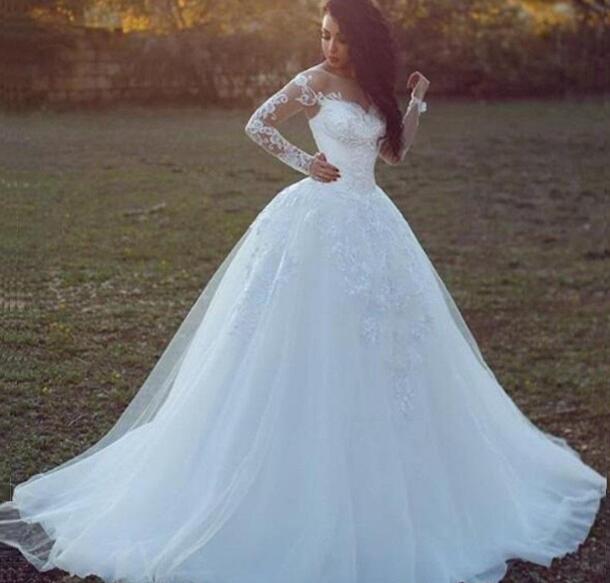 Vintage White Wedding Dresses With Long Sleeve Jewel A Line Chapel Train Tulle Wedding Gowns Bridal Dresses