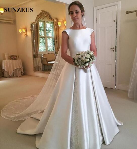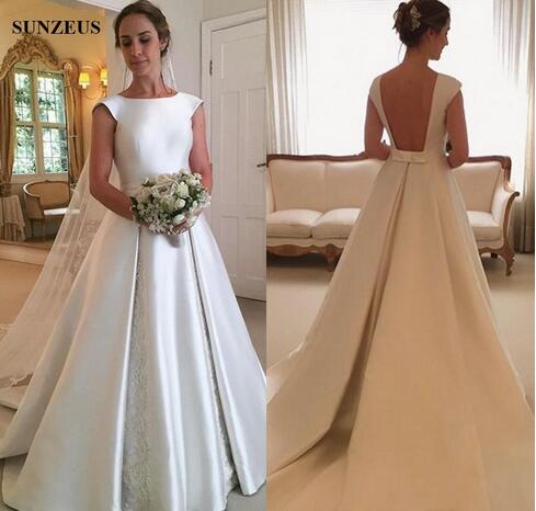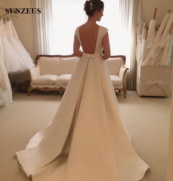 Satin Wedding Dresses A Line Cap Sleeve Sexy Backless Bridal Gowns With Lace vestido de novia manga larga