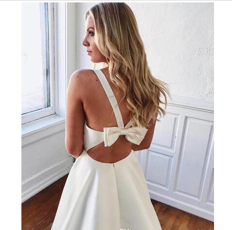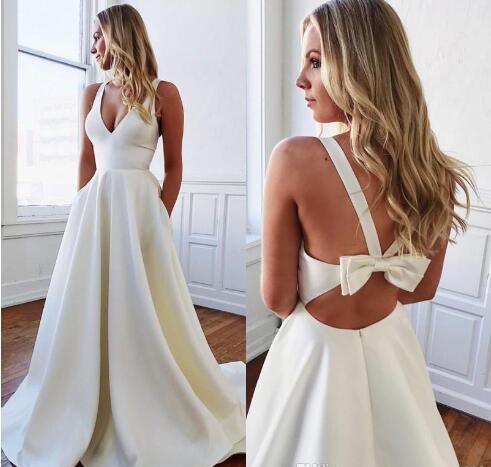 Pure White Satin A Line Wedding Dresses Backless With Bow Bridal Gowns Deep V Neck Sleeveless Summer Cheap Dress