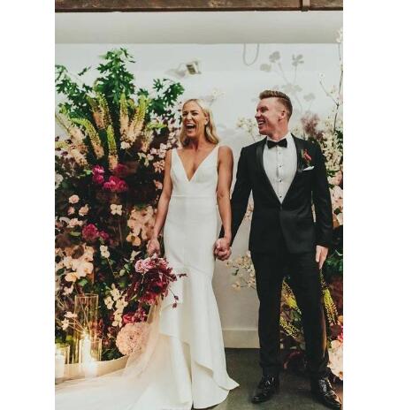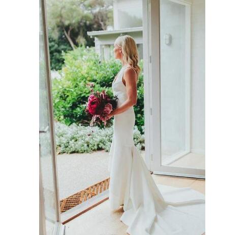 Unique Deep V-Neck Satin Wedding Dresses White Sleeveless Mermaid Wedding Dresses Backless Simple Wedding Dresses with Sweep Train