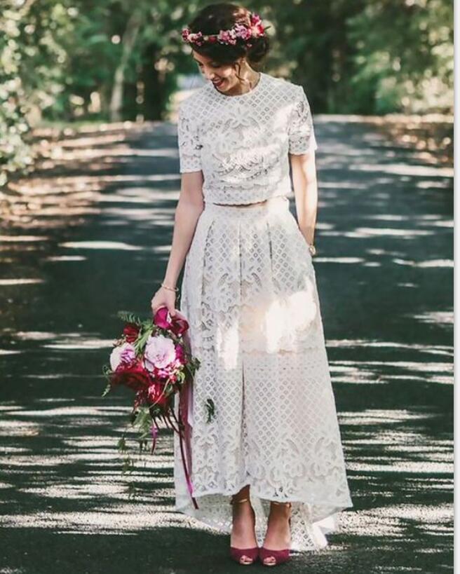 Unique Two Pieces Bohemian Short Sleeve Wedding Dresses Bridal Gowns