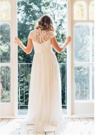 Wedding Dresses Plus size V neck With Short Sleeves Applique Ribbon with Crystal Beaded Chiffon Hollow Back lace Gowns