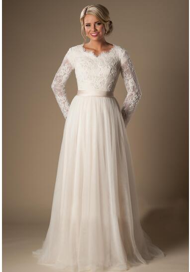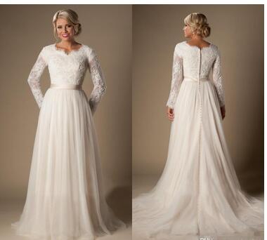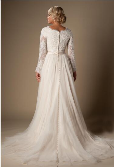 Modest A-Line Lace Tulle Temple Wedding Dresses Long Sleeves V-Neck Sheer Sleeves Trains Buttons Back Bridal Gown