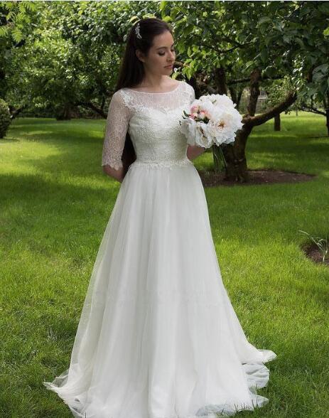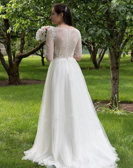 Romantic Country Wedding Dresses Tulle A Line Lace Tops Half Sleeves Floor Length Buttons Back New Arrival Bridal Gowns robe de mariee