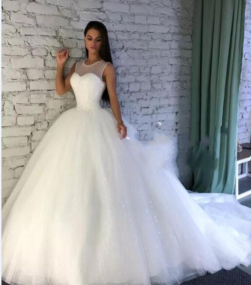 Sparkling Wedding Dresses With Sheer Jewel Neckline Sequins Ball Gown Wedding Dress With Count Train Custom Made Bridal Gowns Plus Size