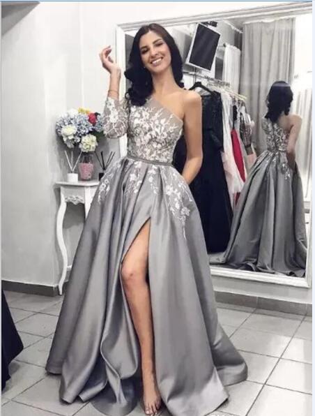 Silver Evening Dresses A-Line One Shoulder Satin Sweep Train Prom Dress Lace Appliqued Side Split Special Occasion Gowns