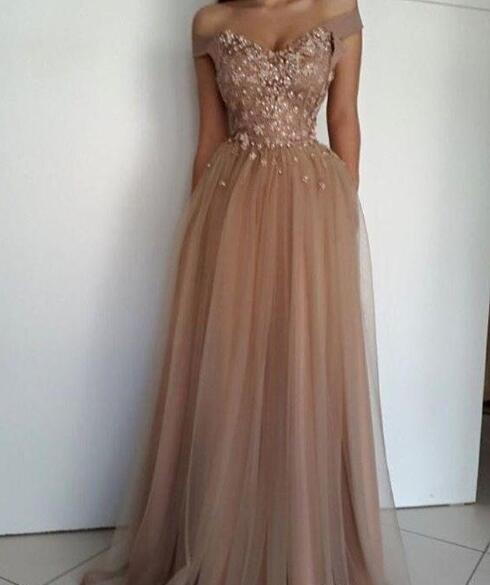 New Off Shoulder Prom Dresses Appliques Pearls Floor Length Tulle Formal Evening Occasion Dresses Party Gown Custom Made