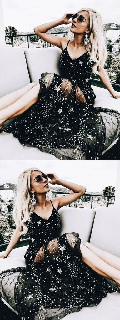 Sexy Sparkly Black Spaghetti Straps A Line Star Long Prom Dress