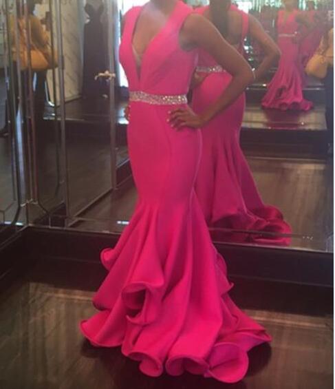 Stunning Sleeveless V-Neck Fuchsia Evening Dresses Mermaid Beads Cheap Sexy Long Prom Gown Sweet 16 Dress with Beading Waist