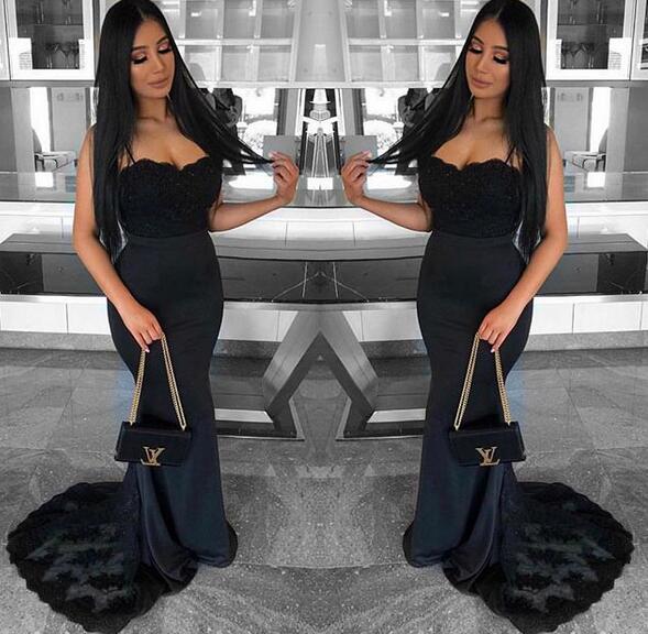 Black Mermaid Prom Dresses Spaghetti Straps Lace Bodice Evening Party Gowns
