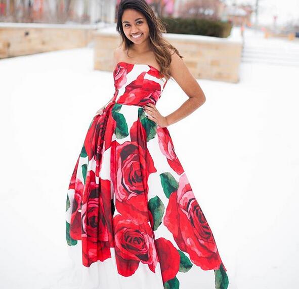 Red Rose Ball Gown Prom Dresses Strapless Floral Evening Party Gowns