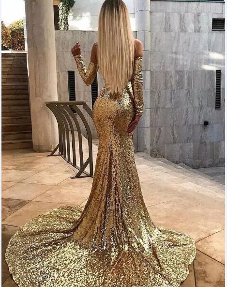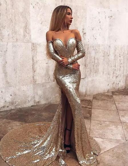Mermaid Prom Dresses Off The Shoulder High Side Split Sweep Train Long Sleeve Sequined Evening Dress Custom Made Formal Party Gowns