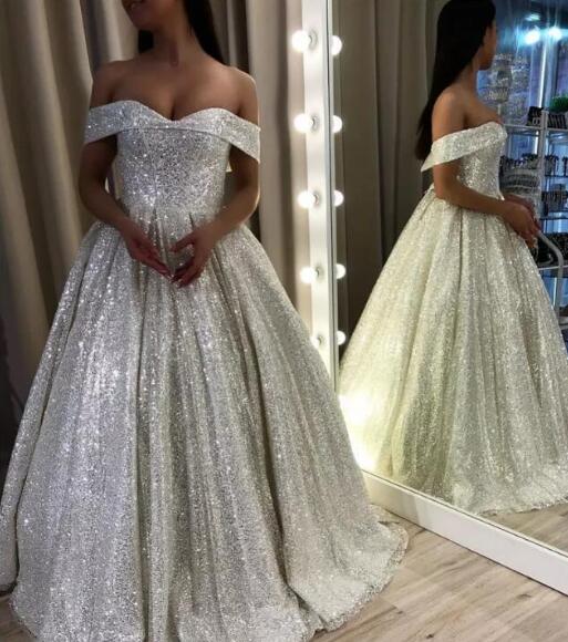 Stunning Silver Sequined Wedding Dresses A Line Off Shoulder Dubai Arabic Elegant Party Celebrity Gowns