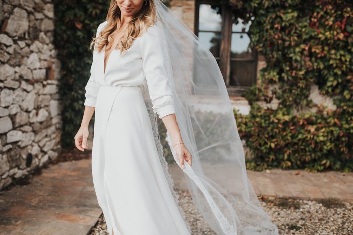 Simple Sheath Wedding Dresses Deep V Neck Long Sleeve Side Slit Bridal Gowns