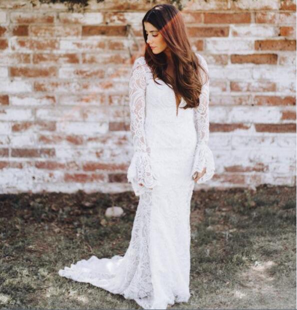 Stunning Mermaid Wedding Dresses V Neck Sheer Long Sleeve Poet Sleeve Delicate Lace Bridal Gowns