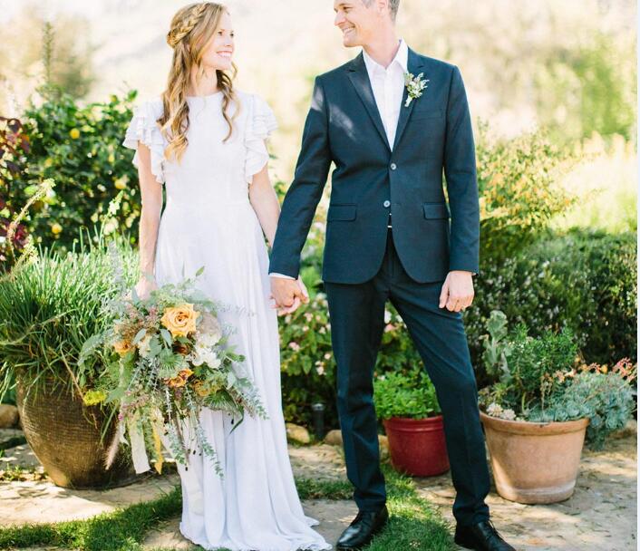Simple A Line Chiffon Boho Beach Wedding Dresses Crew Neck Short Sleeve Ruffle Bridal Gowns