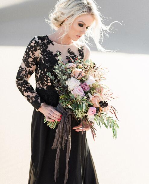 Simple A Line Chiffon Boho Beach Black Wedding Dresses Crew Neck Sheer Long Sleeve Appliques Lace Bridal Gowns