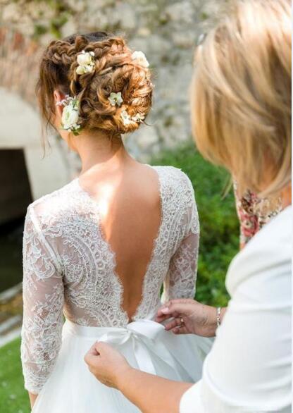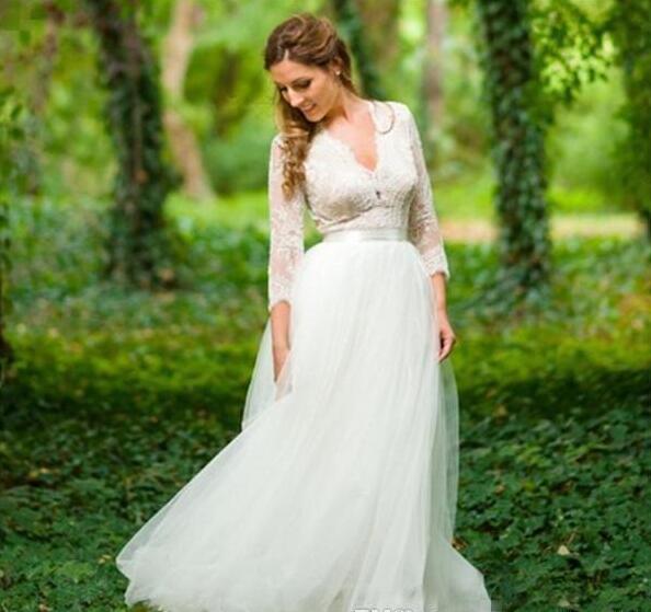 Lace Long Sleeves Spring Wedding Dresses Country V Neck Sexy Backless Bridal Gowns with Ribbon A Line Tulle Dress