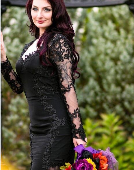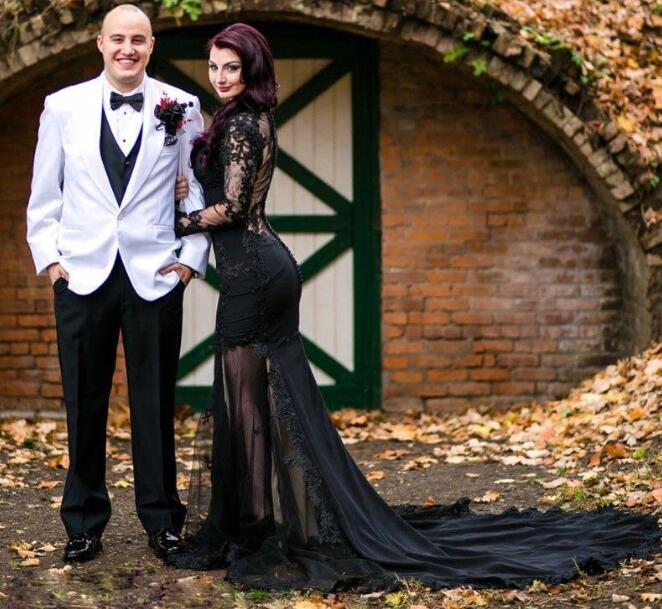 Gothic Style Black Wedding Dress See Through Long Sleeve Handmade Appliques Lace Mermaid Vintage 2019 Bridal Gowns Custom Size