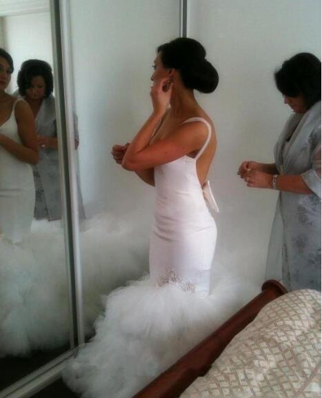 Sexy Open Back with Bow Mermaid Wedding Dresses Spaghetti Straps Long Ruffles Tulle Bridal Gowns