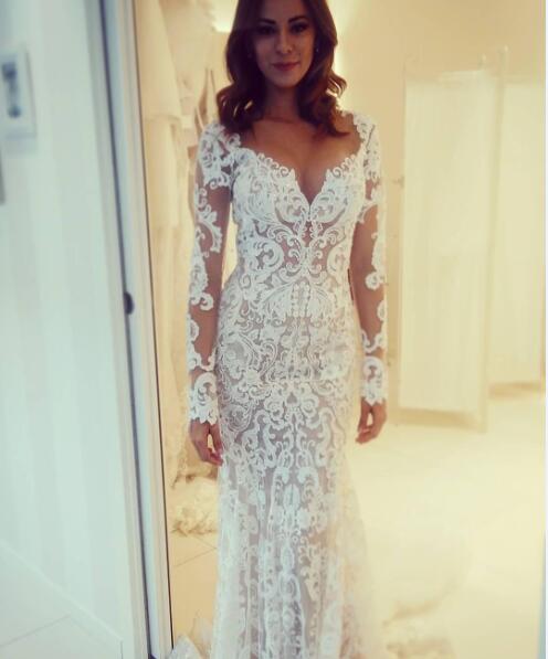 Modest Lace Mermaid Wedding Dresses Long Sleeves V Neck Trumpet Illusion Backless Bridal Gowns Sweep Train robe de mariée