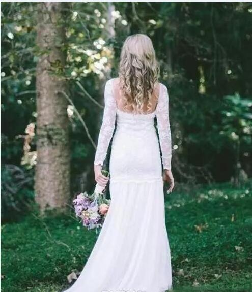 White Chiffon Boho Sheath Wedding Dresses Full Lace Scoop Neck Sexy Garden Country Style Boho Bridal Gowns with Long Sleeves Backless